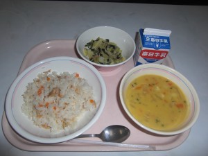 牛乳 ツナピラフ ベーコンと小松菜のソテー コーンスープ