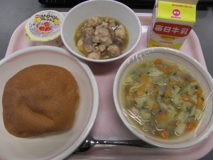 牛乳 米粉パン 鶏肉のバーベキューソース コンソメスープ イチゴゼリー