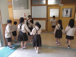 2年生のお兄さん・お姉さんに手を引かれながら、1年生が学校のどこに何があるか、探検しています。なかなか頼もしい2年生です。