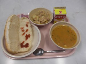 牛乳 コッペパン いちごジャム 新じゃがと新たまのオーブン焼き キャロットスープ
