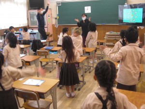 ALTの先生が、1年生の教室にも来てくださいました。1年生はノリノリで英語を繰り返します。担任の先生まで、このとおり盛り上がっています。「What fruits do you like?」「I like peaches!」