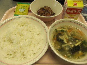 牛乳 ごはん 野菜ふりかけ かつおの竜田揚げ 若竹汁
