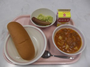 牛乳 コッペパン 焼きソーセージ カレーキャベツ添え ミネストローネ