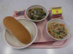 牛乳 コッペパン メープルシロップ 炒めビーフン 中華スープ