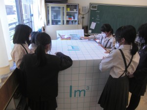 1立方メートルが一体どんな大きさなのか、触ったり中に入ったり、実際に体感する授業です。算数に限りませんが、机上だけでなく、体を使って学んだことは、頭にも心にもしっかりインプットされます。