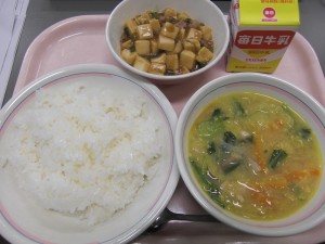 牛乳 ごはん マーボー豆腐 中華風コンソメスープ