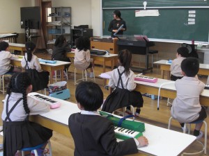鍵盤ハーモニカの音が、音楽室に鳴り響きます。「お母さん指は『人差し指』っていうんだよ。」…などといったことも学びます。