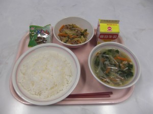 牛乳 ごはん チンジャオロース 小松菜の中華スープ 味付き小魚