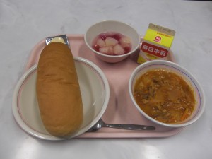 牛乳 コッペパン 型抜きチーズ ポテトのトマトソース煮 フルーツミックス
