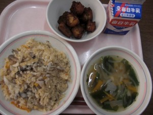 今日の給食は、牛乳・きのこごはん・たらの竜田揚げ・すまし汁 でした。