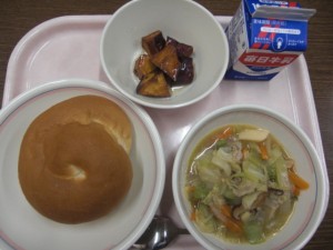 今日の給食は、牛乳・うずまきパン・八宝菜・大学芋 でした。