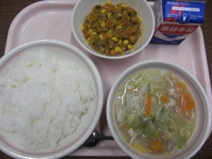 今日の給食は、牛乳・ごはん・ドライカレーの具・白菜スープ でした。
