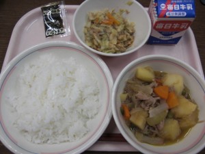 今日の給食は、牛乳・ごはん・のりの佃煮・豚じゃが・ツナと野菜のおかか炒め でした。