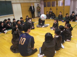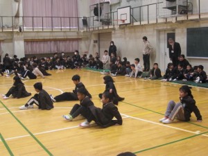 全校児童がシッティングバレーに挑戦しました。まずは動き方…