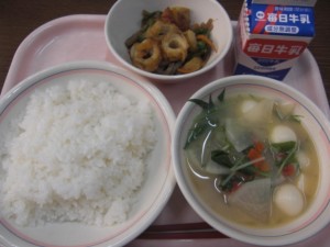今日の給食は、牛乳・減量ごはん・白玉雑煮・竹輪とこんにゃくのごま炒め でした。
