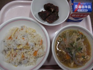 6年生のみですが、今日の給食は、牛乳・里芋ごはん・さばの竜田揚げ・豚汁 でした。