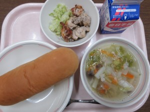 今日の給食は、牛乳・コッペパン・ローストチキンキャベツ添え・白菜スープ でした。