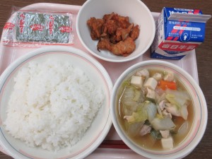 今日の給食は、牛乳・ごはん・味付けのり・ちゃんこ鍋・ちぎりさつま揚げ でした。