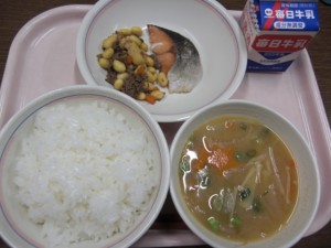 今日の給食は、牛乳・ごはん・鮭の塩焼き・大和煮・みそ汁 でした。