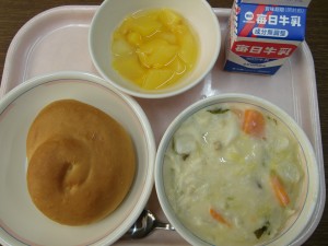今日の給食は、牛乳・うずまきパン・白菜のクリーム煮・フルーツミックスゼリー でした。