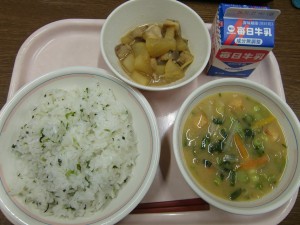 今日の給食は、牛乳・菜飯・ぶり大根・厚揚げのみそ汁 でした。
