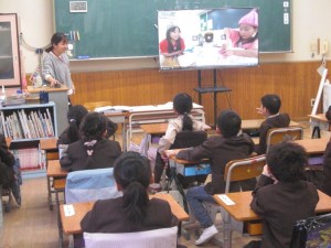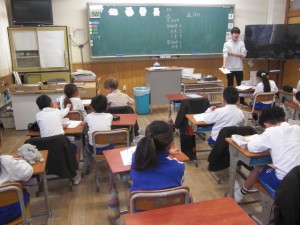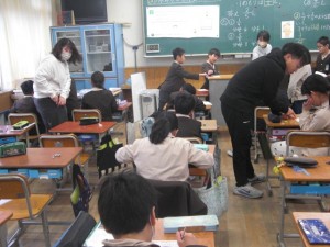 3年算数。分数の難しいところを、先生も子どもも交じって教え合いっこです。