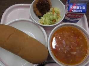 今日の給食は、牛乳・コッペパン・コロッケ・野菜添え・冬野菜のミネストローネ でした。
