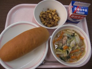 今日の給食は、牛乳・コッペパン・八宝菜・大豆と小魚の揚げ煮 でした。