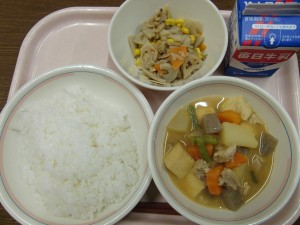今日の給食は、牛乳・ごはん・みそおでん・れんこんの煮物 でした。