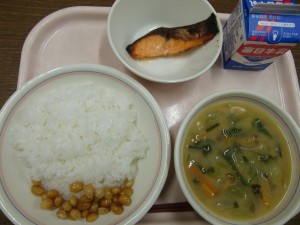 今日の給食は、牛乳・ごはん・かた豆・鮭の塩こうじ焼き・なめこのみそ汁 でした。