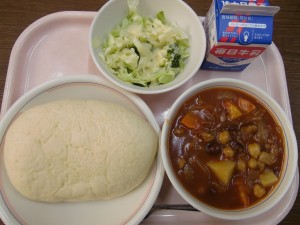 今日の給食は、牛乳・オリーブパン・ビーンズシチュー・ブロッコリーのサラダ でした。