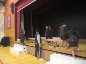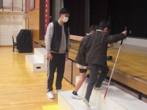 3・4年生は、体育館でアイマスク体験をしました。「ここから昇り階段だよ」