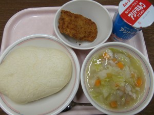 今日の給食は、飲むヨーグルト・オリーブパン・ミラノ風カツレツ・ズッパ(イタリア風スープ) でした。(イタリアメニューです。)