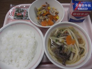 今日の給食は、牛乳・減量ごはん・味付けのり・肉うどん・れんこんの炒め物 でした。
