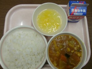 今日の給食は、牛乳・ごはん・「ん」がつくカレーライスの具・ゆずみかんゼリー でした。(冬至メニューです。)