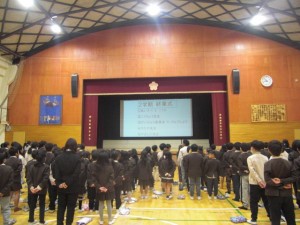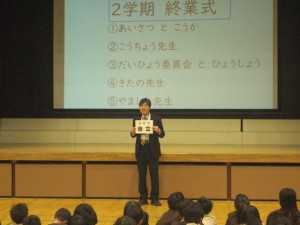 校長先生の話や、募金の報告や、ソフトボールの表彰などがありました。