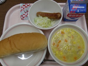 今日の給食は、牛乳・焼きソーセージ・キャベツ添え・コーンスープ でした。