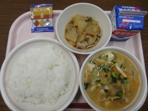 今日の給食は、ごはん・ごまふりかけ・豚肉と大根の煮物・豆腐と油揚げのみそ汁 でした。