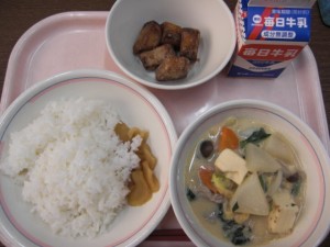 今日の給食は、牛乳・ごはん・つぼ漬け・ぶりの竜田揚げ・豆乳鍋 でした。