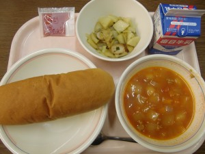 今日の給食は、牛乳・コッペパン・いちごジャム・ソーセージとポテトのオーブン焼き・冬野菜のミネストローネ でした。