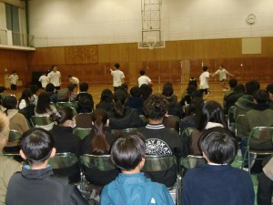 体育館で、中学校生活について映像を交えて教えてもらいました。