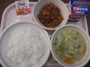 今日の給食は、牛乳・コーヒー牛乳の素・ごはん・フェジョアーダ・白菜スープ でした。(フェジョアーダはブラジル料理です。)