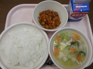 今日の給食は、牛乳・ごはん・フェジョアーダ・花野菜のスープ でした。
