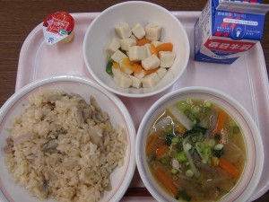 今日の給食は、牛乳・鶏めし・高野豆腐の煮物・豚汁・りんごゼリー でした。