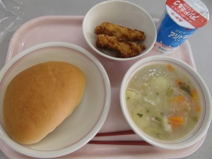 今日の給食は、飲むヨーグルト・パーカーパン・たらフライ・野菜の洋風煮 でした。