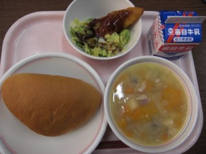 今日の給食は、牛乳・パーカーパン・たらフライキャベツ添え・コンソメスープ でした。