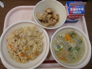 今日の給食は、牛乳・中華おこわ・鶏肉のぴりピリ辛照り焼き・中華スープ でした。