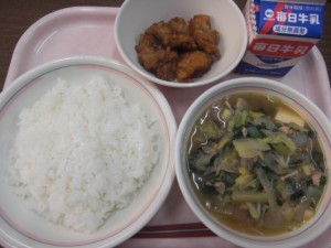 今日の給食は、牛乳・ごはん・鶏すき・ちぎりさつまあげ でした。
