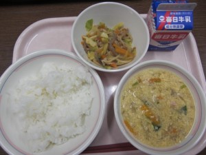 今日の給食は、牛乳・ごはん・豚肉と野菜のみそ炒め・かきたま汁 でした。
