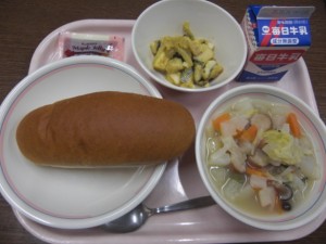 今日の給食は、牛乳・コッペパン・メープルシロップ・ホキのカレー風味焼き・大根のポトフ でした。